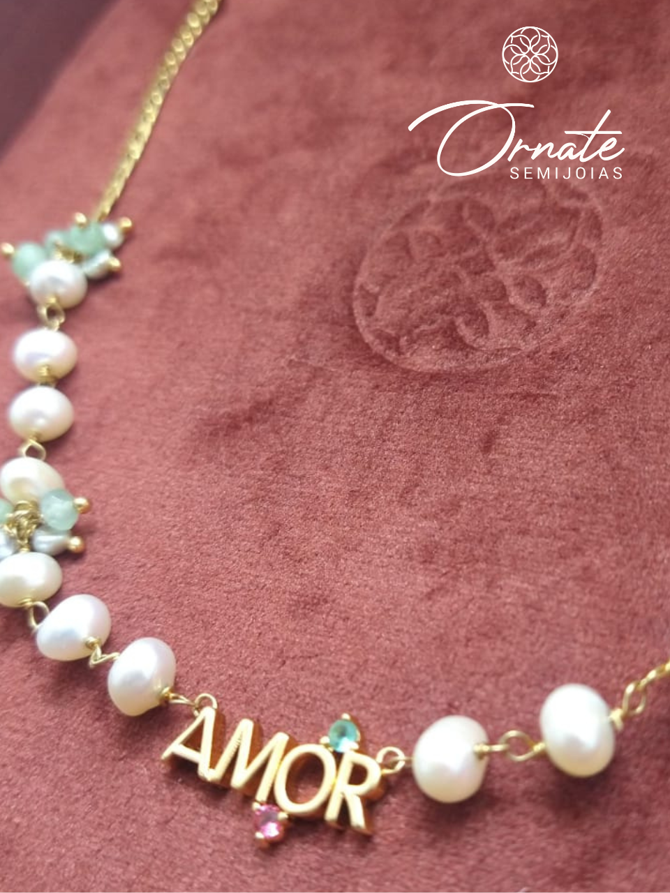 Colar estilo choker com pingente escrito Amor, com pérolas e pedras naturais cor Jade, perfeito para looks delicados e românticos.